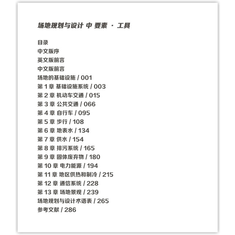 圍繞可持續發展理念,逐一剖析場地的各項廣義上的基礎設施,其類型包括但不限於:多樣化交通、能源管網、電力設施、給水排水、供熱製冷、通信系統、景觀等方面。 本卷在分析闡述全球實踐的傳統方法基礎上,進一步引入了創新規劃設計的相關理念和方法工具,以回應全球城市當下和未來場地規劃可持續、智慧化、即時按需等新的發展趨勢。
