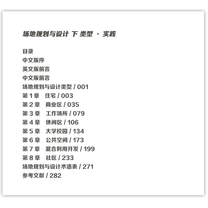 結合優秀實踐案例,分類闡述了場地規劃設計的範式和原型。 案例類型包括但不限於:住宅、商業區、工作場所、休閒區、大學校園和公共空間等,所選實踐涵蓋全球發達和發展中國家的多座城市。 本卷旨在分析物質空間的形體塑造和功能要素組織的設計技能基礎上,深化場地規劃和設計“為人”和“永續”的價值內涵,勾勒場所營造的全球優秀實踐。