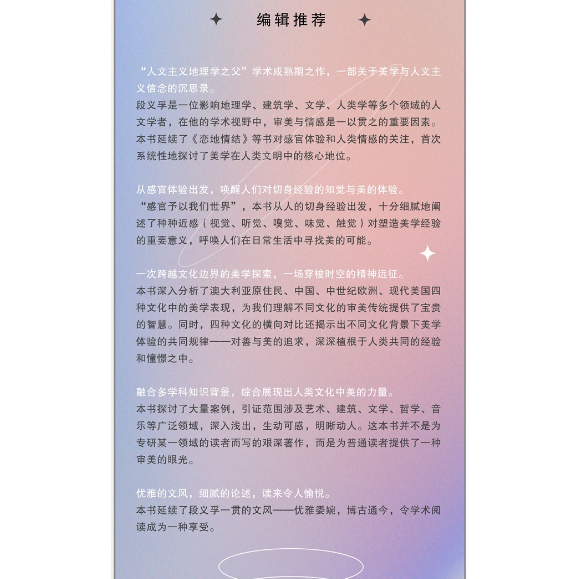 本書是人文主義地理學家段義孚集中探討美學的一本著作,生動展現了感覺與美在我們的個人及社會生活中所扮演的關鍵角色。美不僅是文化的一個側面,而是居於其核心?既為其驅動力,同時也是其*極目標。