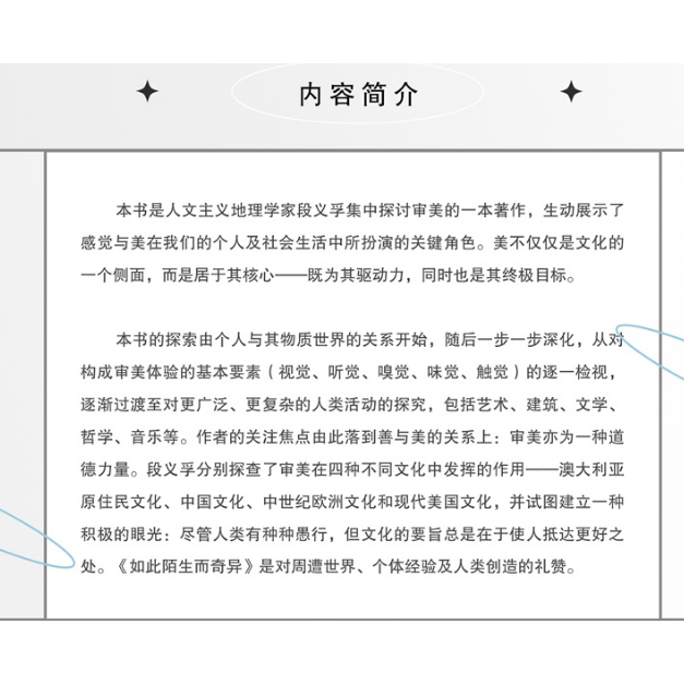 本書的探索由個人與其物質世界的關係開始,隨後一步一步深化,從對構成美感經驗的基本要素(視覺、聽覺、嗅覺、味覺、觸覺)的逐一檢視,逐漸過渡至對更廣泛、更複雜的人類活動的探究,包括藝術、建築、文學、哲學、音樂等。作者的關注焦點由此落到善與美的關係:美感亦為一種道德力量。段義孚分別探討了美學在四種不同文化中所扮演的角色──澳洲原住民文化、中國文化、中世紀歐洲文化和現代M國文化,並試圖建立一種正面的眼光:儘管人類有種種愚行,但文化的要旨總是在於使人抵達更好之處。 《如此陌生而奇異:感官與美感的地理學》是對周遭世界、個體經驗及人類創造的禮贊。