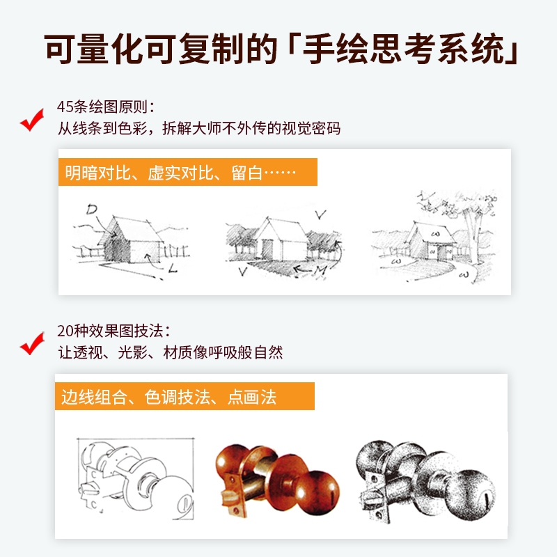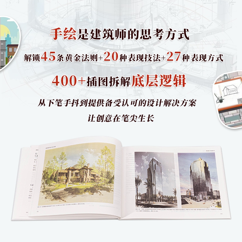 本書是一本教授建築手繪表現與技法的實用性書。開頭就談到了繪畫的心態,再從使用工具、繪製線稿到上色,介紹了不同的繪畫技巧和表現手法,將每種繪畫的效果用豐富的實例展現出來,由淺入深,從原理到實踐,使讀者能夠對建築空間草圖繪畫有一個系統的認知。本書分為九個章節:涉及繪圖狀態、繪圖原則、表現技法、表現形式、文字書寫等,包含45個繪圖原則和27種表現方式。書中擁有近400張彩色插圖,精選了大量作品進行分析展示,將設計方法完整展現,圖文清晰,內容詳細。