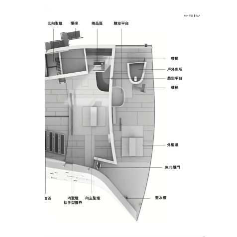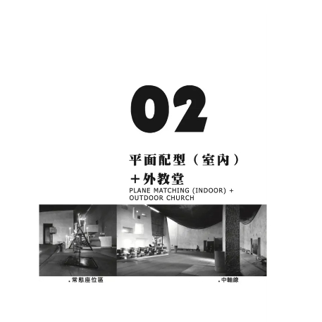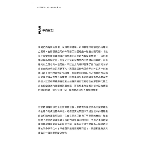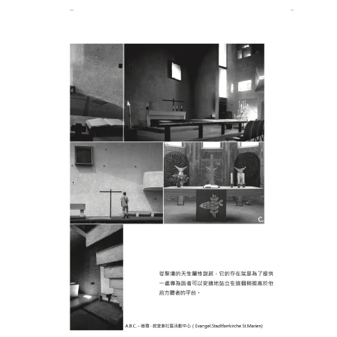 以「前言」為出發,梳理從高第(Antoni Gaudí)到柯比意之間的建築思想演變,並深入探討建築師如何藉由一系列空間元素(如牆、窗、柱、屋頂)構築出一座「無法複製」的教堂。接著,書中細緻分析「平面配型+外教堂」的配置策略,從座位區、聖壇、告解室、中軸線到內外教堂的關係邏輯,強調每一個設計選擇背後的信仰重量與現實鬥爭。