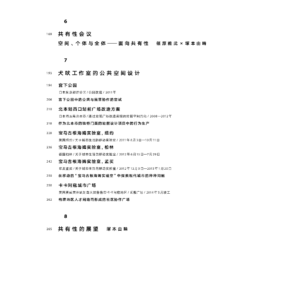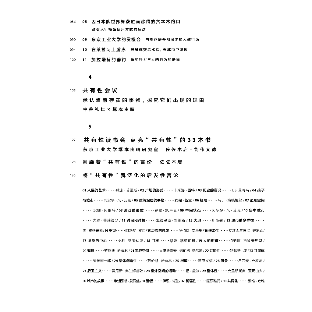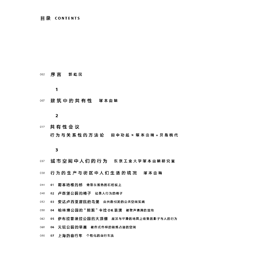 本書共包含8個章節,以文章、對談、案例研究、閱讀筆記等形式,圍繞著「建築的共通性」等議題展開探討。在對談章節,日本藝術家田中功起、歷史工學學者中谷禮仁、社會哲學學者篠原雅武分別從各自專業角度對「共同體」概念及人類行為進行解讀,為理解「共有性」的本質提供多樣化視角;「共有性讀書會」章節列出3 3本與「共通性」概念相關的書籍,拓展了這一概念的理論基礎;案例研究涉及對日本、中國、歐洲共十餘個城市的空間觀察,以及對犬吠工作室實踐項目的詳細介紹,為讀者提供了關於「建築的共有性」的感性認知。