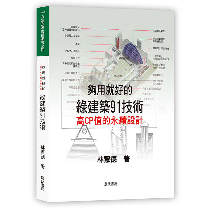 總之,本書絕不強調昂貴的高科技,也不鼓勵大量綠色採購,不是抄襲歐美綠建築技術的大雜匯,而是提供一系列本土化、實用化的綠建築實用設計資訊,是夠用就好、高CP值的綠建築技術,因此也冠上「夠用就好的綠建築91技術」。建築業者只要遵照這些基本要項進行設計,不但可達到高水準的EEWH系統評估結果,也可獲得省電、省水、省錢的實質效益。但願,本書能搭起政府綠建築政策與民間綠建築設計的橋樑。