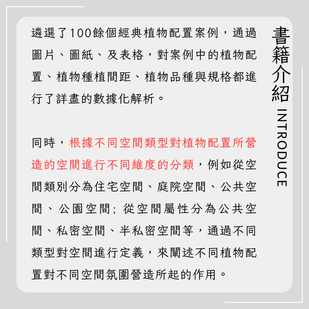 《圖解景觀設計 100個經典植物配置》遴選了100餘個經典植物配置案例,透過圖片、圖紙、及表格,對案例中的植物配置、植物種植間距、植物品種與規格都進行了詳盡的數據化解析。同時,根據不同空間類型對植物配置所營造的空間進行不同維度的分類,例如從空間類別分為住宅空間、庭院空間、公共空間、公園空間;從空間屬性分為公共空間、私密空間、半私人空間,從空間規模分為大型空間、中型空間、小型空間,透過不同類型對空間進行定義,來闡述不同植物配置對不同空間營造所起的氛圍。