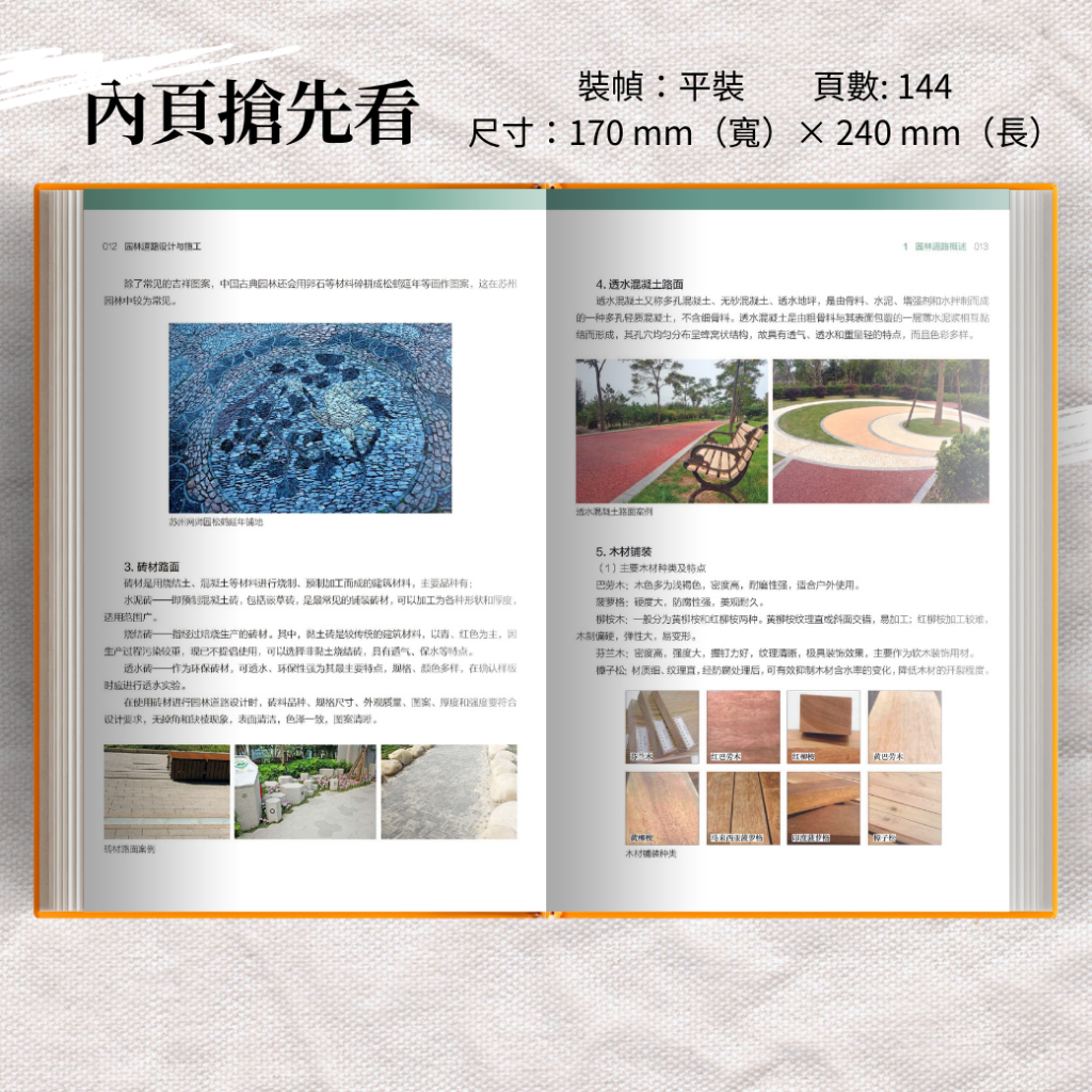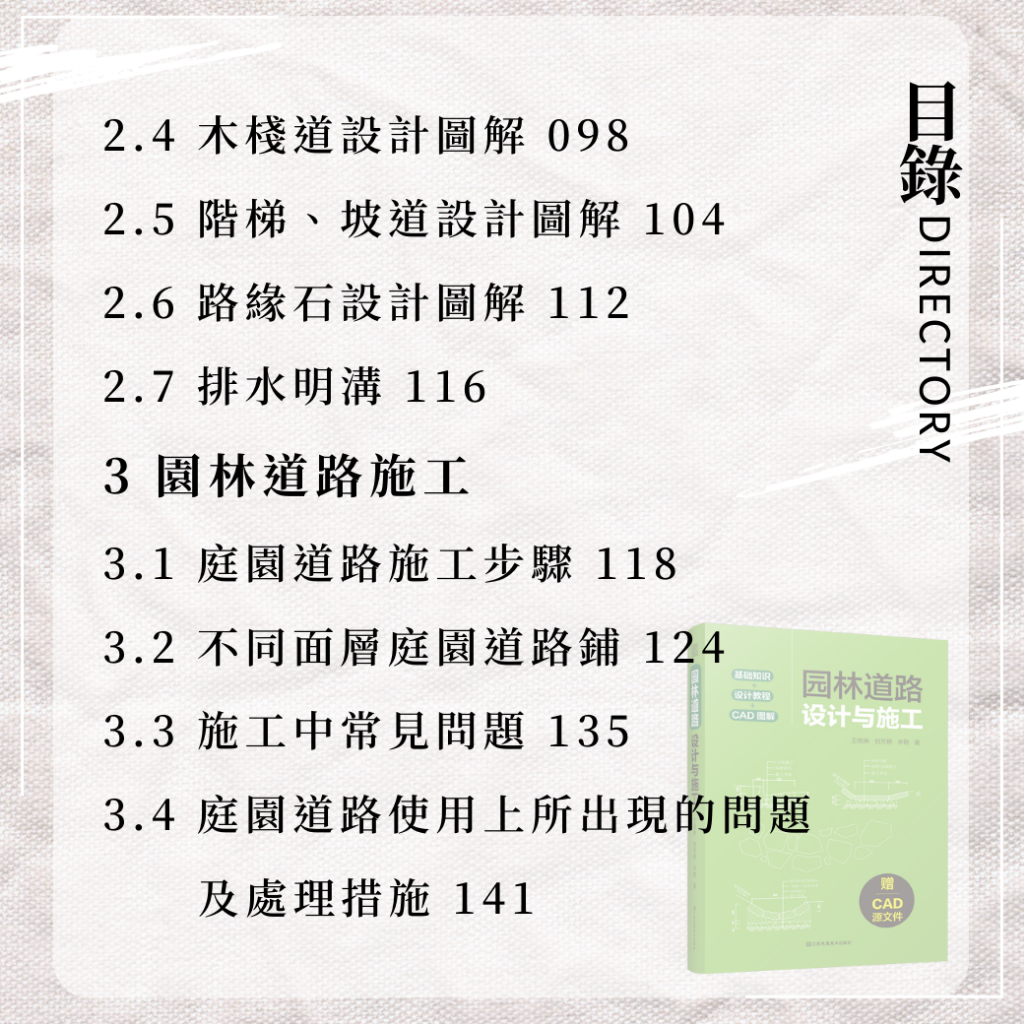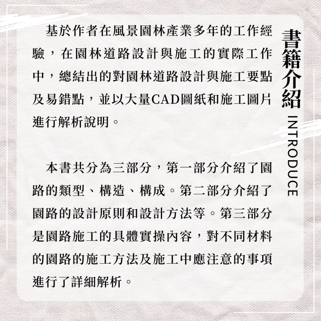 《園林道路設計與施工》基於作者在風景園林行業多年的工作經驗,在園林道路設計與施工的實際工作中,總結出的對園林道路設計與施工要點及易錯點,並以大量CAD圖紙和施工圖片進行解析說明。 本書共分為三部分,第一部分介紹了園路的類型、構造、構成,並對不同材料的園路進行詳細的解析。 第二部分作為本書的重點部分,主要介紹了園路的設計原則和設計方法,並以施工圖的方式展示了不同類型園路的設計方法和構成,還展示了園路不同組成部分的設計與施工方案。 第三部分是園路施工的具體實操內容,對不同材料的園路的施工方法及施工中應注意的事項進行了詳細解析,並指出園路施工中可能出現的問題,同時給出了解決方案。