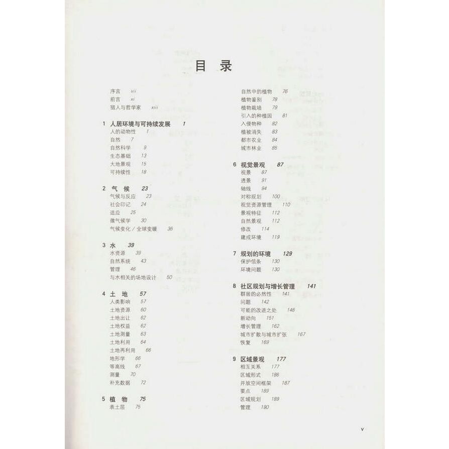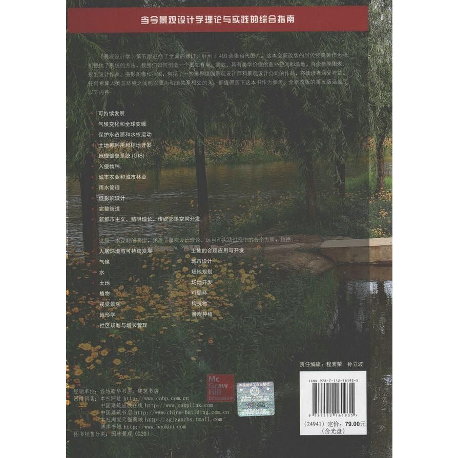 《景觀設計學:場地規劃與設計手冊(原著第五版)》引用了400餘張當代圖片,以一種全新動態的陳述方法來說明如何使人類與環境和諧相處。 《景觀設計學:場地規劃與設計手冊(原著第五版)(附光碟)》著的關於環境規劃和景觀設計的時代潮流,包括可持續發展、氣候變化、水資源保護、土地再利用、城市農業、雨水管理、低影響設計等。