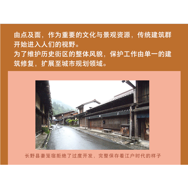 從古都到街區/發現古都奈良/平城宮遺址上的再現/近代都市京都的風緻/《古都保存法》:京都與鎌倉/保全京都的景觀/都市美:倉敷/環境與慶典:高山/旅遊的對策:妻籠/傳統建築群保護地區的出現/傳統建築群的保護/向保護城市整體進發:海野宿、大森銀山與函館/城市保護的現況:金澤與東京