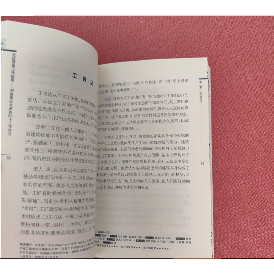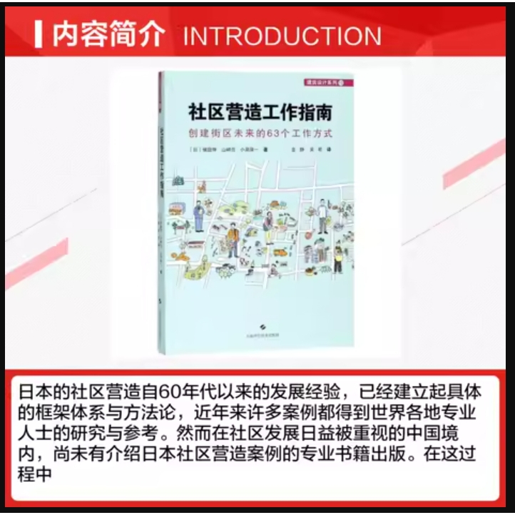 日本的社區營造自60年代以來的發展經驗,已經建立起具體的框架體系與方法論,近年來許多案例都得到世界各地專業人士的研究與參考。然而在社區發展日益被重視的中國境內,尚未有介紹日本社區營造案例的專業書籍出版。在這過程中,中國城鄉的大規模發展的浪潮裡也多了一些別樣的聲音,隨著控制大城市規模政策的製定,城市發展由新城建設向舊城功能完善方向的改變,人們已經逐漸接受了「從增量發展到存量發展」這一說法。饗庭伸、山崎亮、小泉瑛一著的《社區營造工作指南(創建街區未來的63個工作方式)》採訪了在日本從事一線社造工作的不同身份的規劃師,以及各行各業的社造創業者的故事,為讀者全方面的展現社區設計師這門充滿朝氣且化的職業的眾多可能性。
