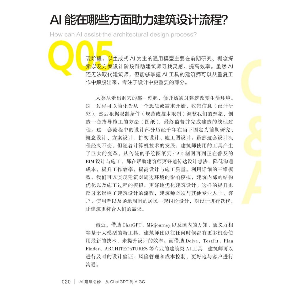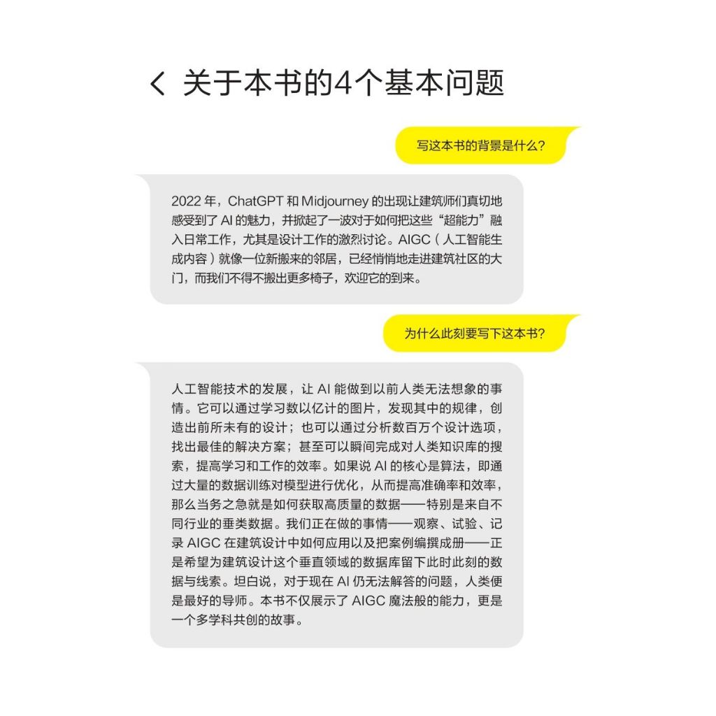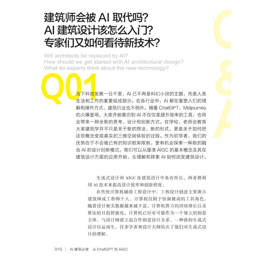 CHAPTER1 AI,你好! Q01 建築師會被AI取代嗎?AI建築設計該怎麼入門?專家們又如何看待新技術? Q02 AIGC是如何發展起來的? Q03 建築師為什麼需要關注AIGC? Q04 應該如何學習和應用AIGC技術?
