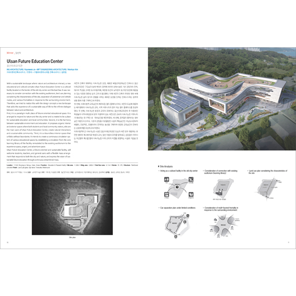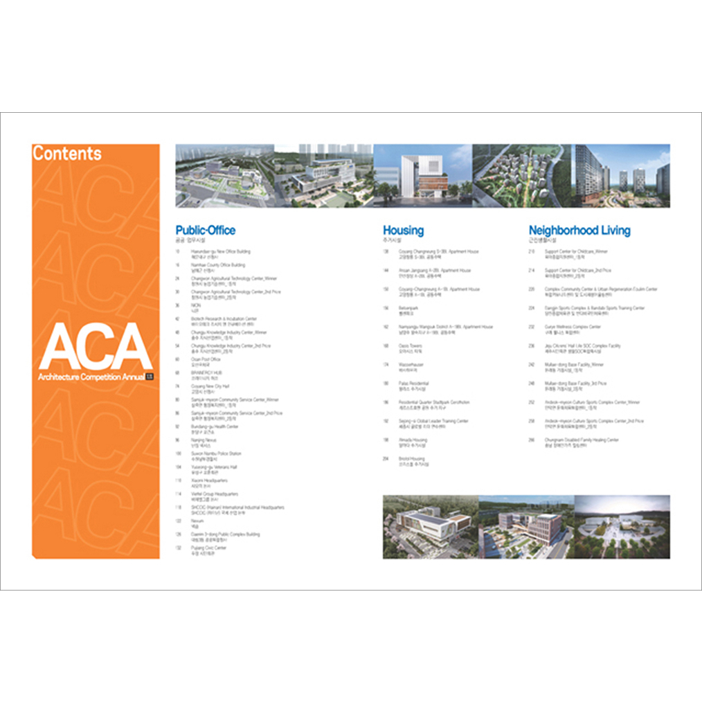 “ACA_Architecture Competition Annual 19,20”從截至2022年舉行的設計競賽中選出90件作品,分為兩冊,按用途分類:文化設施、住宅、公共ㆍ社區設施、教育設施、辦公設施、其他 (包括住宿、運動、醫療設施)。