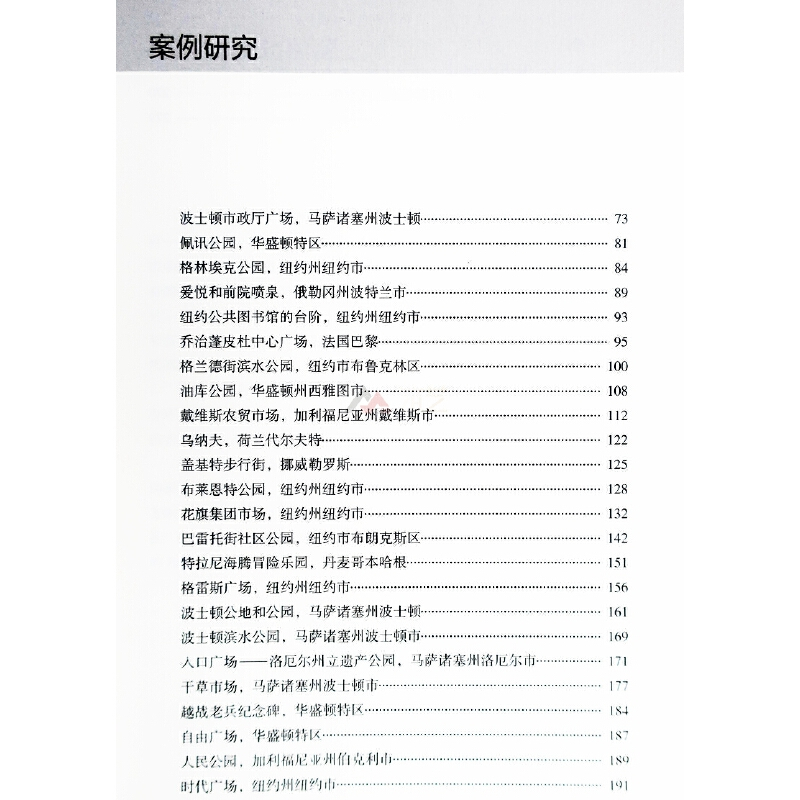 全書共九章,分為三大部分。第一部分為“公共空間與公共生活”,論述了公共空間的價值、本質及其演變;第二部分為“公共空間里人的因素”,包括公共空間裡的需求、權利、公共空間的意義和關聯;第三部分為“創造公共空間”,從使用維度、過程、公共空間的未來三個面向展開。