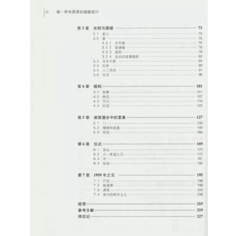 讀者會從六個主題章節中看到,獨立的細部設計以及其重要作用,在勒·柯布西耶的建築中是怎樣編排的——在每一個章節,本書先對每種類型的細部問題進行研究,然後透過照片和大樣圖,以及相關檔案資料等一系列實例進行說明。最後一部分,從整體性研究一種單獨空間的角度,將所有的在主題中整合在一起。本書的研究重點,放在細部的形式和撐其設計的概念。其結果,主要給讀者形成對以下問題的全面性理解——即細部設計是怎樣與勒·柯布西耶的設計策略相適配的,以及他是如何在其哲學思想的脈絡中運用細部設計的。