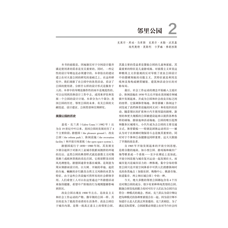 克萊爾庫柏馬庫斯(Clare Cooper Marcus):世界知名景觀設計師、加州大學風景園林系及建築系榮譽教授。共同創辦了顧問設計公司,為設計公司提供使用者需求分析服務。曾撰寫多本關於公共開放空間設計的理論著作,並獲得美國底特律自由新聞年度圖書大獎、美國風景園林師協會交流優異獎等。