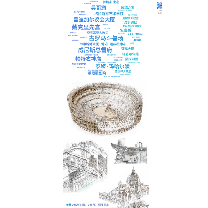 《透視建築》選取各國建築師的50件建築作品,輔以400餘幅高清照片與大幅手繪立體剖切圖、細部圖,讓你了解這些建築史上著名的房子是如何建成的,為你揭示建築立面與完成面背後的秘密。 50棟建築涵蓋古今,從古羅馬競技場、吳哥窟,到包浩斯、貝聿銘擴建的羅浮宮,再到流水別墅、馬岩松設計的夢露大廈,以及聖保羅大教堂、聖家族大教堂。本書由建築史學者提供專業講解,梳理歷史文化背景,探索建築的重點空間,分析相關建築思潮的發展,為這些*聞名的建築提供全面的回顧;配有高清大幅照片展示建築全貌,鉛筆淡彩立體剖切圖、細部圖、平面圖及立面圖,精準度圖展示建築全貌,鉛筆淡彩立體剖切圖、細部圖、平面圖及立面圖,精準度圖鑑你無法觀察到的部份,不同層次的淡透