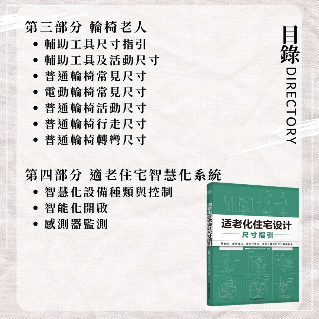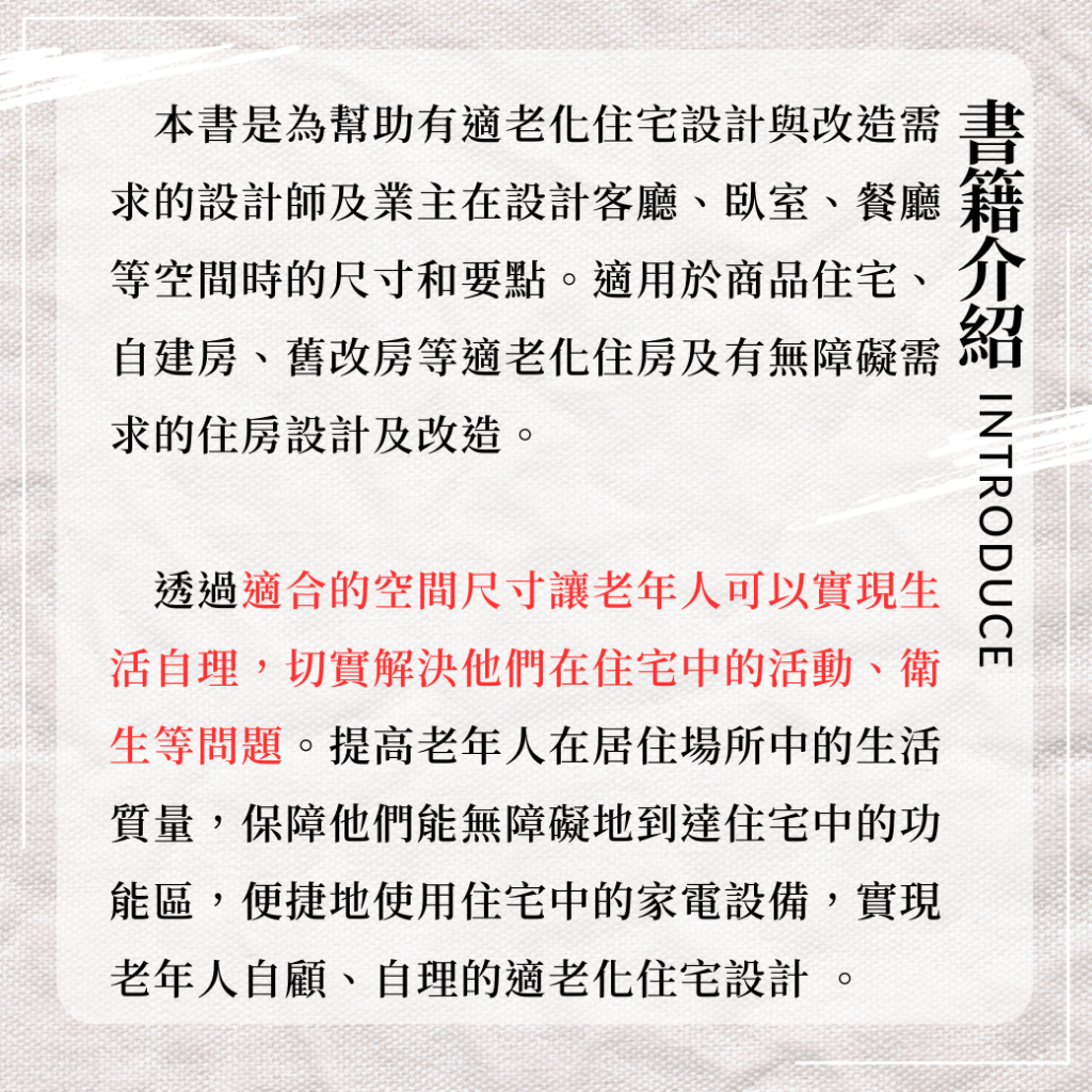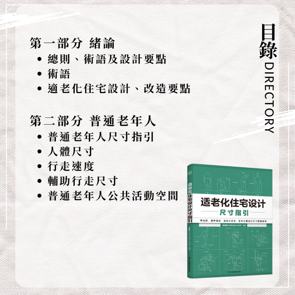 本書是為説明有適老化住宅設計與改造需求的設計師及業主在設計客廳、臥室、餐廳、廚房、書房、衛生間、陽臺、門窗傢俱及電器設備、社區花園、入戶大堂、電梯間等空間時的尺寸和要點。 適用於商品住宅、自建房、舊改房、養老院住房、康養酒店住房(公寓)等適老化住房及有無障礙需求的住房設計及改造。