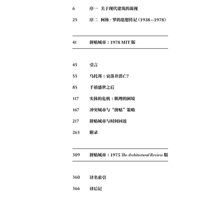 《拼貼城市》是一本具有劃時代意義的理論著作,自面世以來,就引起了學界內的高度關注,許多著名學府將其選為教材。本書所涉足的範圍很廣,從經典哲學、社會學、政治學,到現代學術、現代文學、城市建築史等等,為讀者展現了一個宏大的人文領域場景,以此來談論現代建築與城市,涉及現代建築的歷史背景和人文根源的剖析,更以大量圖片對比呈現出歷史上的重要城市形態。原建築工業出版社的譯文有一些問題,這次同一譯者重新翻譯,將關於現代建築以及當代社會所面臨危機的觀點,本書結合知識社會學的多重領域研究成果,以一種更為冷靜的理性主義立場,對現代建築的理性基礎進行了重構,對歷史中曾經出現過的各種烏托邦思想進行考察,避免了理想化的形式主義由於過度簡化和排他性而缺乏包容性的那種自閉症特徵,將建築和城市的形式語言重新與社會的現實性、文化的多元性以及政治的多樣性這類更為廣泛的議題聯繫起來。