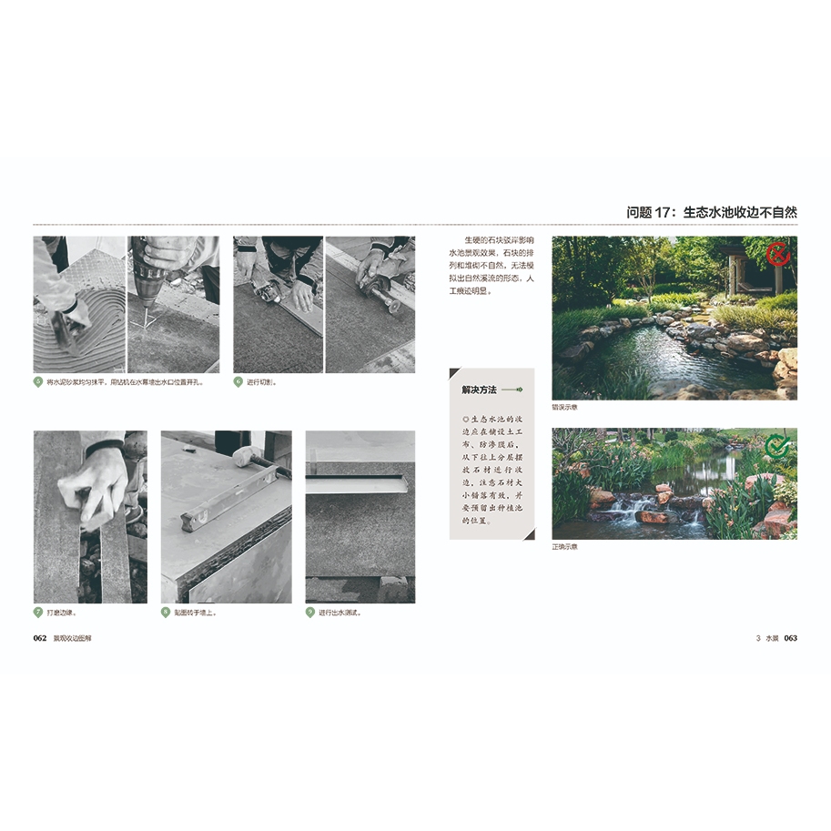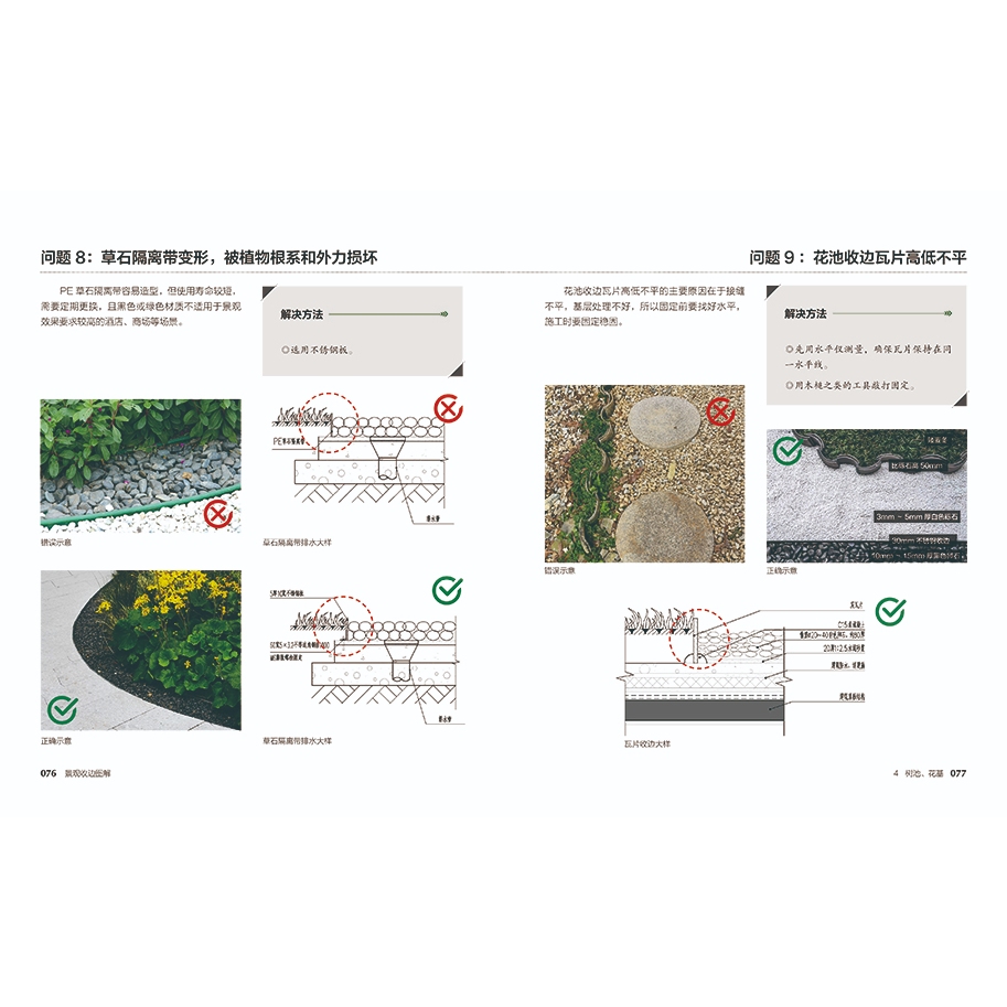 本書以「發現問題→找到問題原因→透過技術解決問題→具體施工步驟展示」的編排方式,收錄了近百種收邊實例,分別按人行道和園路收邊、戶外平台收邊、水景收邊、樹池(或花基)收邊、取水點(或排水口)收邊、管井收邊、景觀照明收邊和構築物收邊進行分類,含大量二維大樣圖、施工步驟工藝圖,同時也特別收錄了錯誤和正確的實景示意,方便讀者閱讀和理解,適合景觀設計師和相關施工人員參考借鑒。