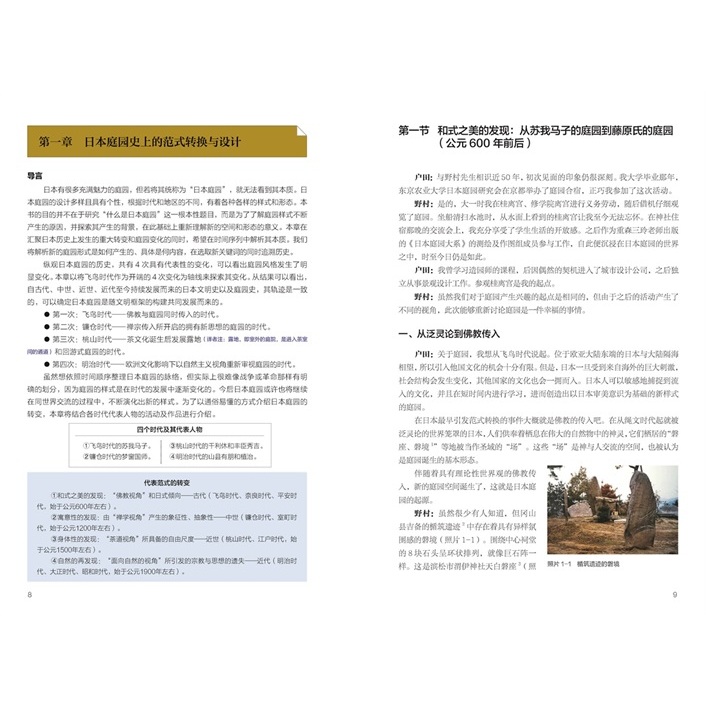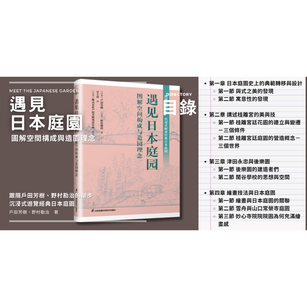 本書通過景觀設計師戶田芳樹和庭園研究家兼作庭家野村勘治兩位庭園大師的對話,從空間創造者的角度切入,重新審視日本庭園,並對眾多不同庭園潛藏的姿態進行說明。 不接近拘泥於學院派理論學說,從與以往不同的視角切入,對日本庭園進行討論,帶領讀者走近日本庭園的本質。 將宗教、哲學、藝術、風俗等橫向軸線,嵌入以時代為單位的歷史縱向軸線中,對從橫縱軸線的相關關係中建立起來的庭園空間、形態以及由此產生的行為展開專業而生動的解析。